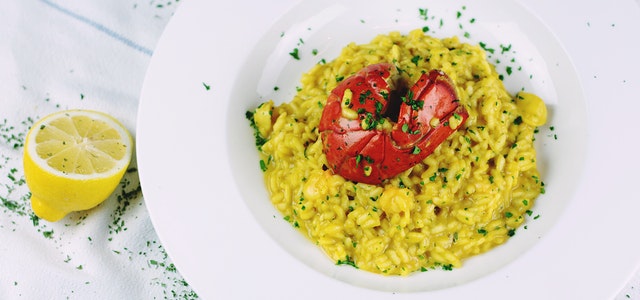 Una brioche al vapore con astice, crema di spada, datterini gialli, brunoise di peperoni e maionese al nero.
